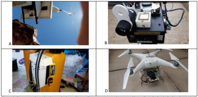 Sistemas embarcados do Projeto Prometeu: A) estação meteorológica fixa; B) Sonda Saphira 3v6 (móvel); C) Sonda Oba v1, acoplada à bomba costal; D) Sonda Prometeu v1, integrada a um drone.(Créditos: Arquivo pessoal/Projeto Prometeu – Prof. Carlos Henke de Oliveira)