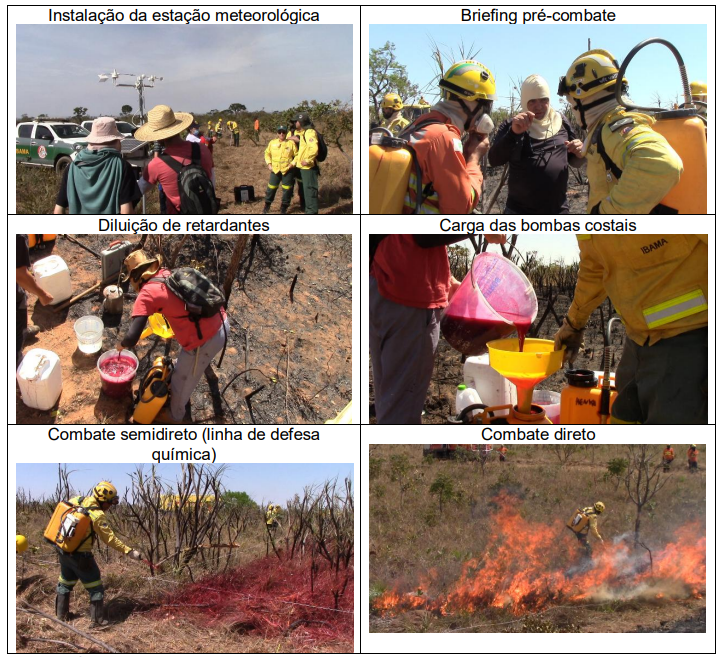 Etapas do Projeto Prometeu em campo: desde a instalação da estação meteorológica e o briefing pré-combate até a preparação das soluções químicas e o carregamento das bombas costais, que antecedem a aplicação dos retardantes no fogo. (Créditos: Arquivo pessoal/Projeto Prometeu – Prof. Carlos Henke de Oliveira)