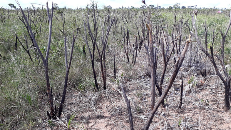 Impacto ambiental: efeitos da fitotoxicidade do boro, que provocou a mortalidade do estrato rasteiro e arbustivo do Cerrado (ex.: Canela-de-ema – Vellozia squamata). (Créditos: Arquivo pessoal/Projeto Prometeu – Prof. Carlos Henke de Oliveira).