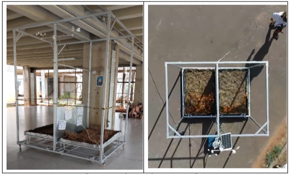 Embarcado Osíris 1.07: visão geral panorâmica e aérea do sistema em operação, utilizado para monitorar os efeitos de queimadas experimentais. (Créditos: Arquivo pessoal/Projeto Prometeu – Prof. Carlos Henke de Oliveira)